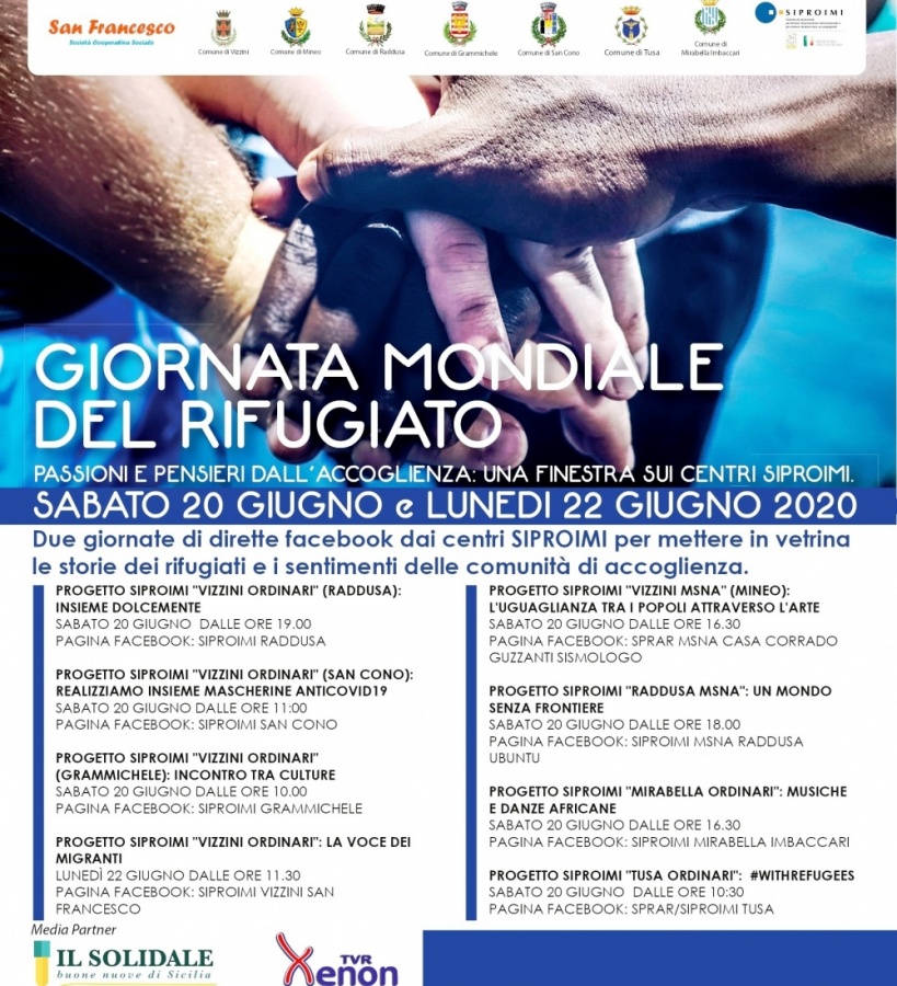 Il 20 giugno, come ogni anno, ricorre la Giornata internazionale del rifugiato. In questo giorno in tutto il mondo si rende onore a chi, a causa di guerre e persecuzioni, è costretto a fuggire e abbandonare la propria terra natia. La Giornata ha il fine di sensibilizzare la pubblica opinione, i governi e le istituzioni e risulta adesso ancora più importante poiché, a causa della pandemia Covid-19 e del conseguente lockdown, in molti Paesi i rifugiati sono rimasti isolati, privi di risorse economiche e spesso senza accesso a ogni tipo di assistenza. E a Caltagirone, la Giornata mondiale del Rifugiato di quest’anno verrà celebrata sia sabato 20 giugno, ma anche lunedi 22 giugno, con l’iniziativa “Passioni e pensieri dall'accoglienza: una finestra sui centri Siproimi” che prevede una serie di dirette Facebook dai centri Siproimi che ci sono nel compresorio calatino, nell’intento di “mettere in vetrina le storie dei rifugiati e i sentimenti delle comunità di accoglienza”. A promuovere tale speciale evento sono la Cooperativa “San Francesco” s.c.s. di Caltagirone, in collaborazione con i Comuni di: Vizzini, Mineo, Raddusa, Grammichele, San Cono, Tusa (ME) e Mirabella Imbaccari, insieme al Servizio Centrale SIPROIMI. Non faranno mancare il loro apporto, il giornale on-line IL SOLIDALE (diretto da Salvo Cona) e la nota emittente televisiva calatina TVR XENON (Ch.289). Nell'articolo si può leggere il calendario delle dirette Facebook.